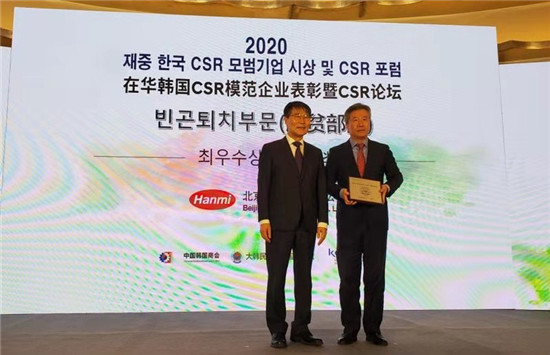 2020年12月,“2020在華韓國CSR模范企業(yè)表彰暨CSR論壇”在北京舉行?;顒?dòng)以企業(yè)社會(huì)責(zé)任貢獻(xiàn)度為基準(zhǔn),評(píng)選出了多家模范企業(yè)。其中,北京韓美藥品有限公司被授予“2020社會(huì)責(zé)任(CSR)模范企業(yè)——脫貧部門最優(yōu)秀獎(jiǎng)”,得到了來自韓國駐華大使等權(quán)威人士的高度認(rèn)可和鼓勵(lì)。