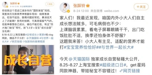 正是因為這種契合,張踩玲與天貓國際母嬰不謀而合地提出了「成長自營」的育兒理念,于微博發(fā)布趨勢長圖文清單,分享自己對于「成長自營」的理解以及各場景可選擇的優(yōu)質兒童營養(yǎng)產品。在其帶動下,葉一茜、眾多微博年輕寶媽紛紛響應,從自己育兒的不同場景出發(fā),分享對于「成長自營」的認可與共鳴。