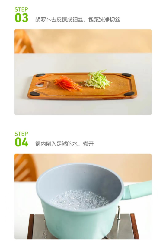 STEP 03 胡蘿卜去皮擦成細絲,包菜洗凈切絲。