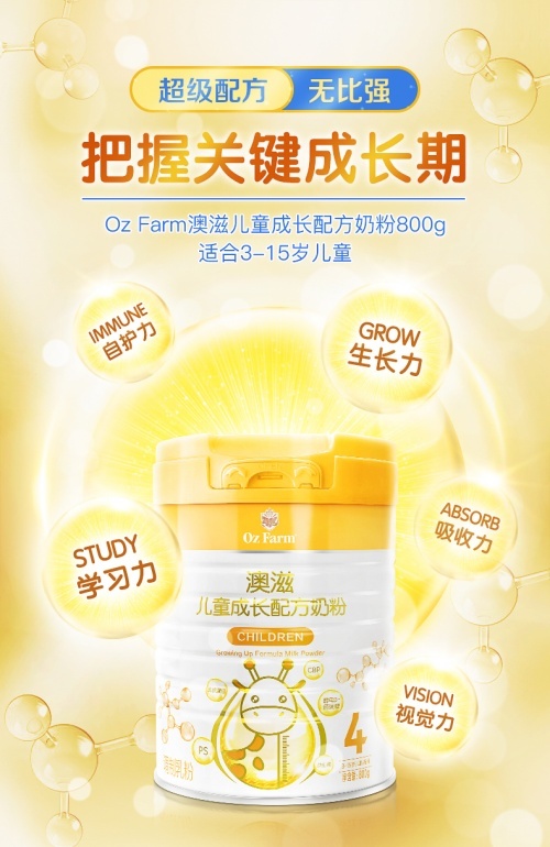 OzFarm澳滋品牌,創(chuàng)始于2010年,始終倡導(dǎo)健康陽(yáng)光的生活方式,不斷發(fā)掘天然健康的力量,精心研發(fā)奶粉配方,致力于為生命的每個(gè)階段提供專屬的營(yíng)養(yǎng)方案與健康選擇。為了幫助青少年兒童補(bǔ)充關(guān)鍵營(yíng)養(yǎng),使其成長(zhǎng)不留遺憾,澳滋此次從3~15歲兒童需求出發(fā),由營(yíng)養(yǎng)專家團(tuán)隊(duì)精心研發(fā)科學(xué)營(yíng)養(yǎng)配方,重磅上新澳滋兒童成長(zhǎng)配方奶粉!