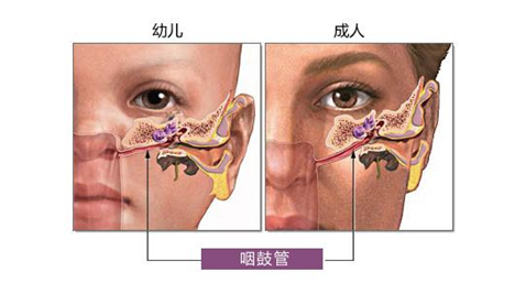 在中耳腔內(nèi),有一條細(xì)管子通往鼻咽部,被稱為咽鼓管。當(dāng)咽鼓管軟骨處于負(fù)壓狀態(tài)時(shí),管壁塌陷導(dǎo)致咽鼓管堵塞,中耳壓力改變,出現(xiàn)耳膜充血、腫脹,形成粘液并滋生病菌。再加上兒童的咽鼓管直徑短、寬且直,呈水平位,更容易出現(xiàn)咽鼓管功能障礙,引發(fā)中耳炎。