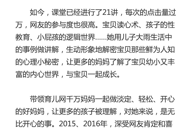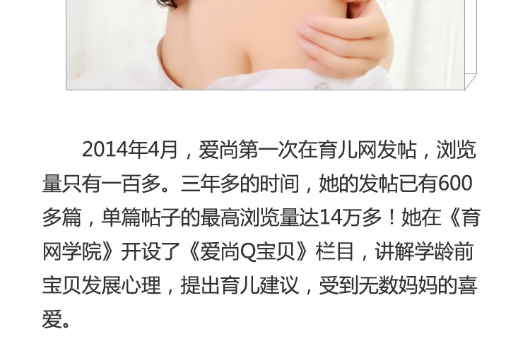 育網(wǎng)對話:育兒網(wǎng)人物訪談?lì)悪谀俊Mㄟ^與明星紅人、父母級達(dá)人的對話,分享先進(jìn)育兒理念,傳遞育兒正能量。